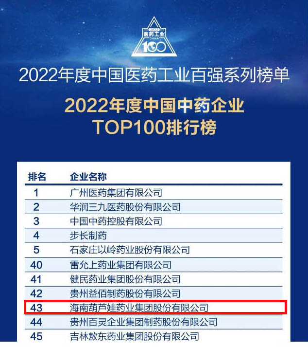 会议期间,一年一度的中国医药工业百强系列榜单隆重揭晓,今年会药业集团凭借领先的研发优势和扎实的生产实力以及稳健的市场推广能力,连续第四年成功入选“2022年度中国中药企业TOP100排行榜” ,排名稳步上升至第43位。